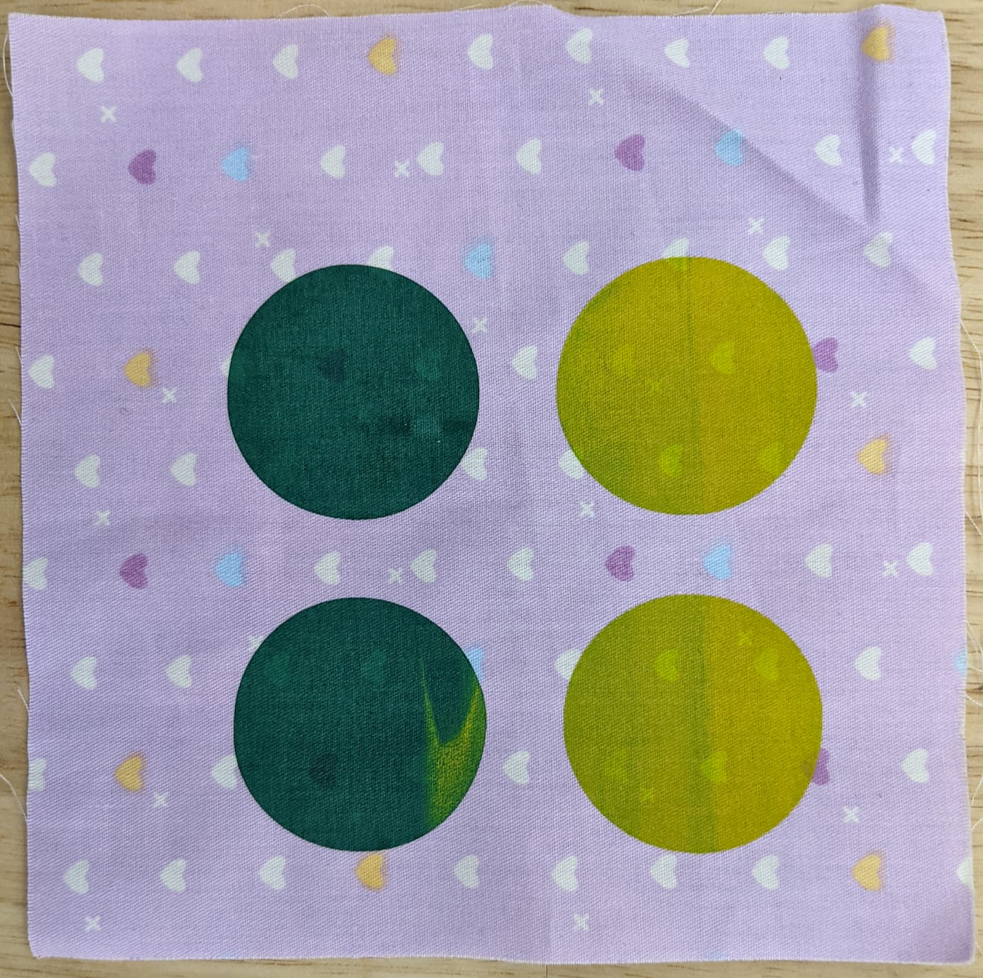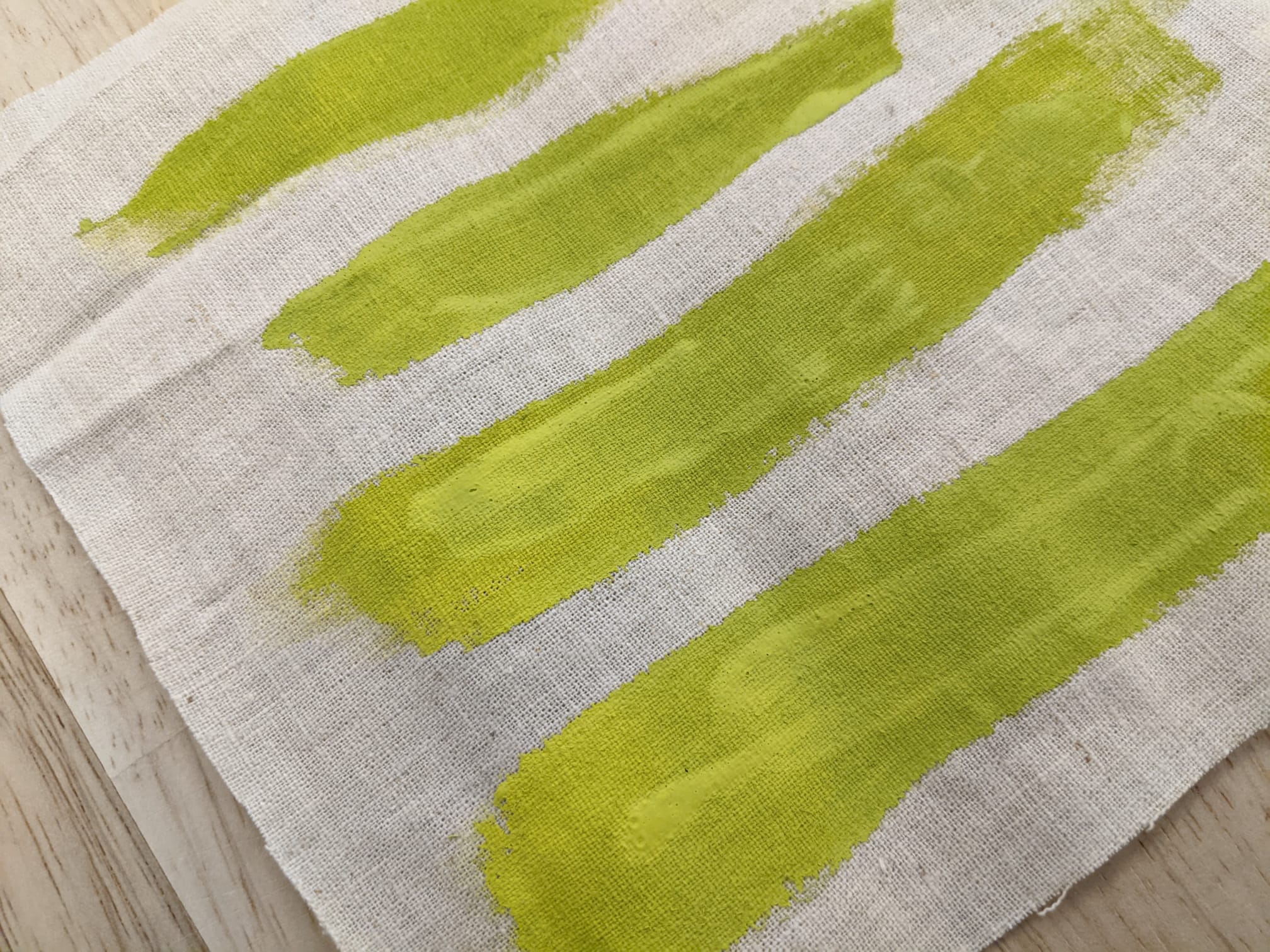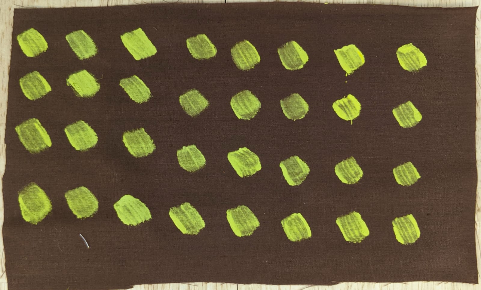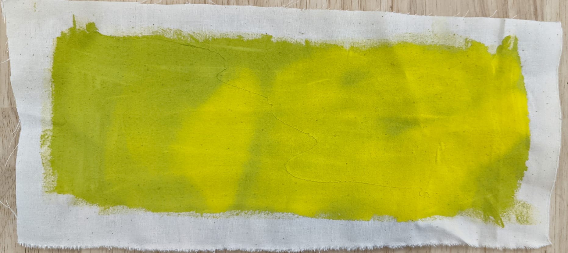 I mixed close to equal parts green dye, yellow paint, white paint and transparent base to create a light green mixture, which when heated would turn lemon yellow as the thermochromic green would disappear. I created various swatches to explore how I could vary the colour change depending on the application of the paint on fabric.