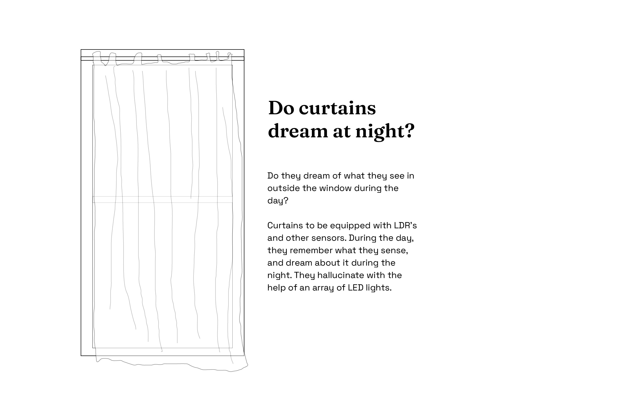 I've always wondered what a life of a curtain is like. Looking out of the window all day and night, what do they think about? This is why I decided to work on this project to build a curtain that could express its thoughts. What do curtains dream of at night?